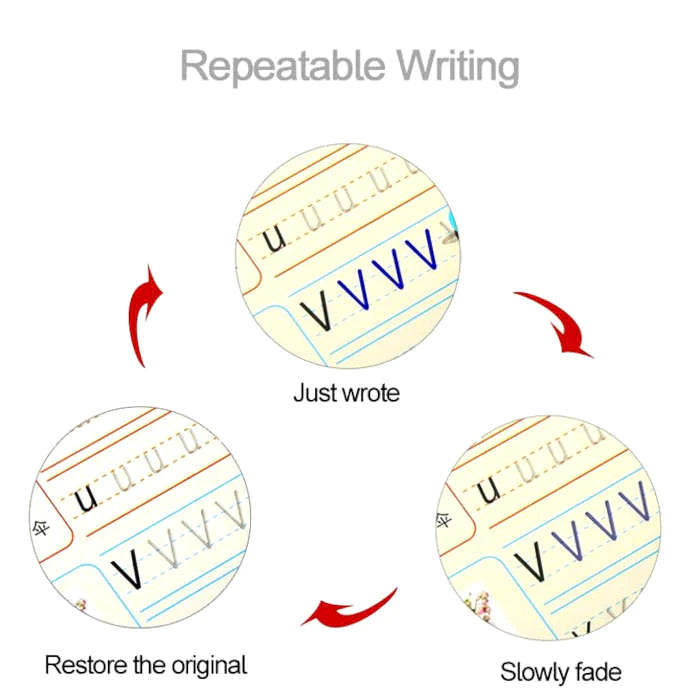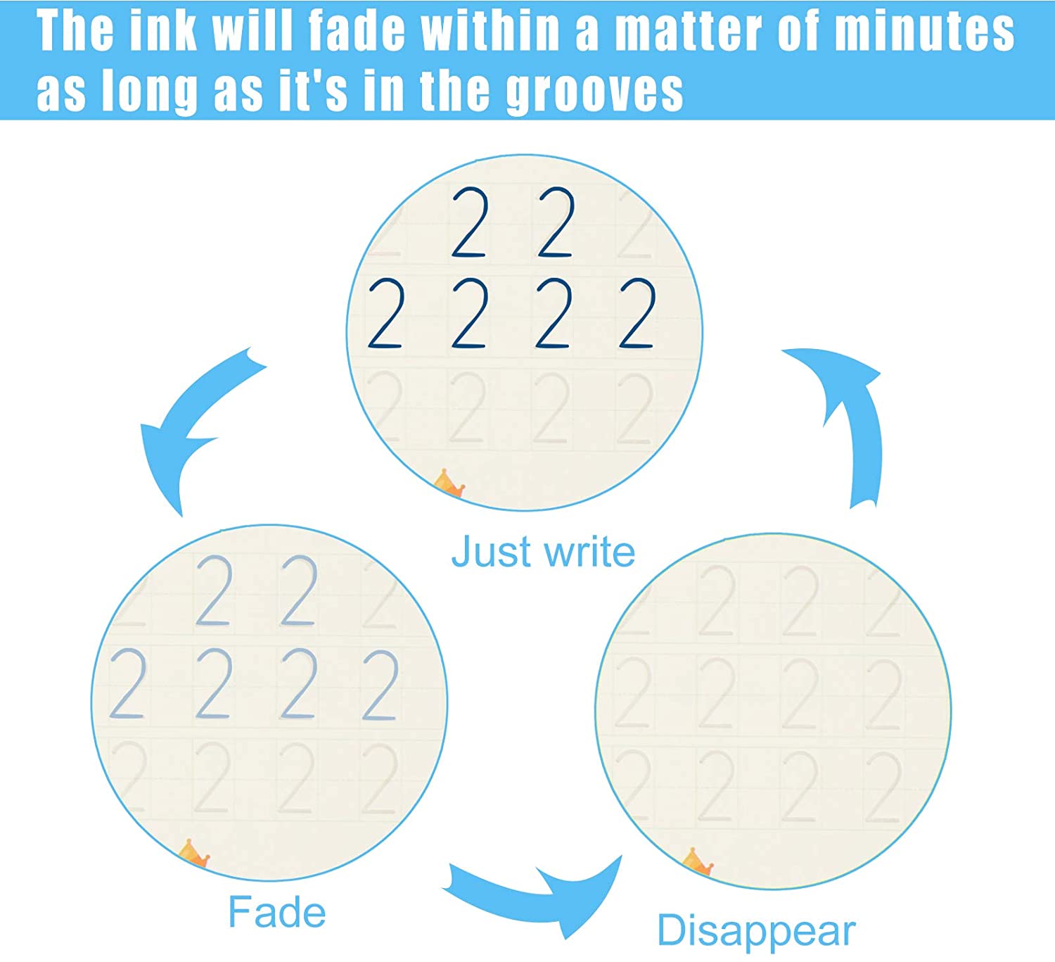 With each copybook, we offer you a set of pencil grip set. The handwriting will disappear within 15 minutes after writing, so the copybook can be reused. There are 1 pen holder and 5 pen cores, and the children can practice for a long time.